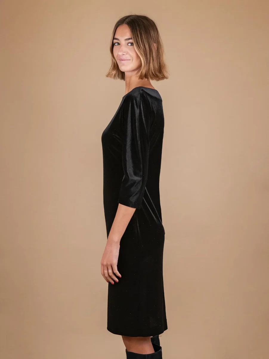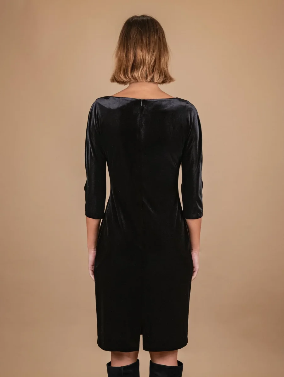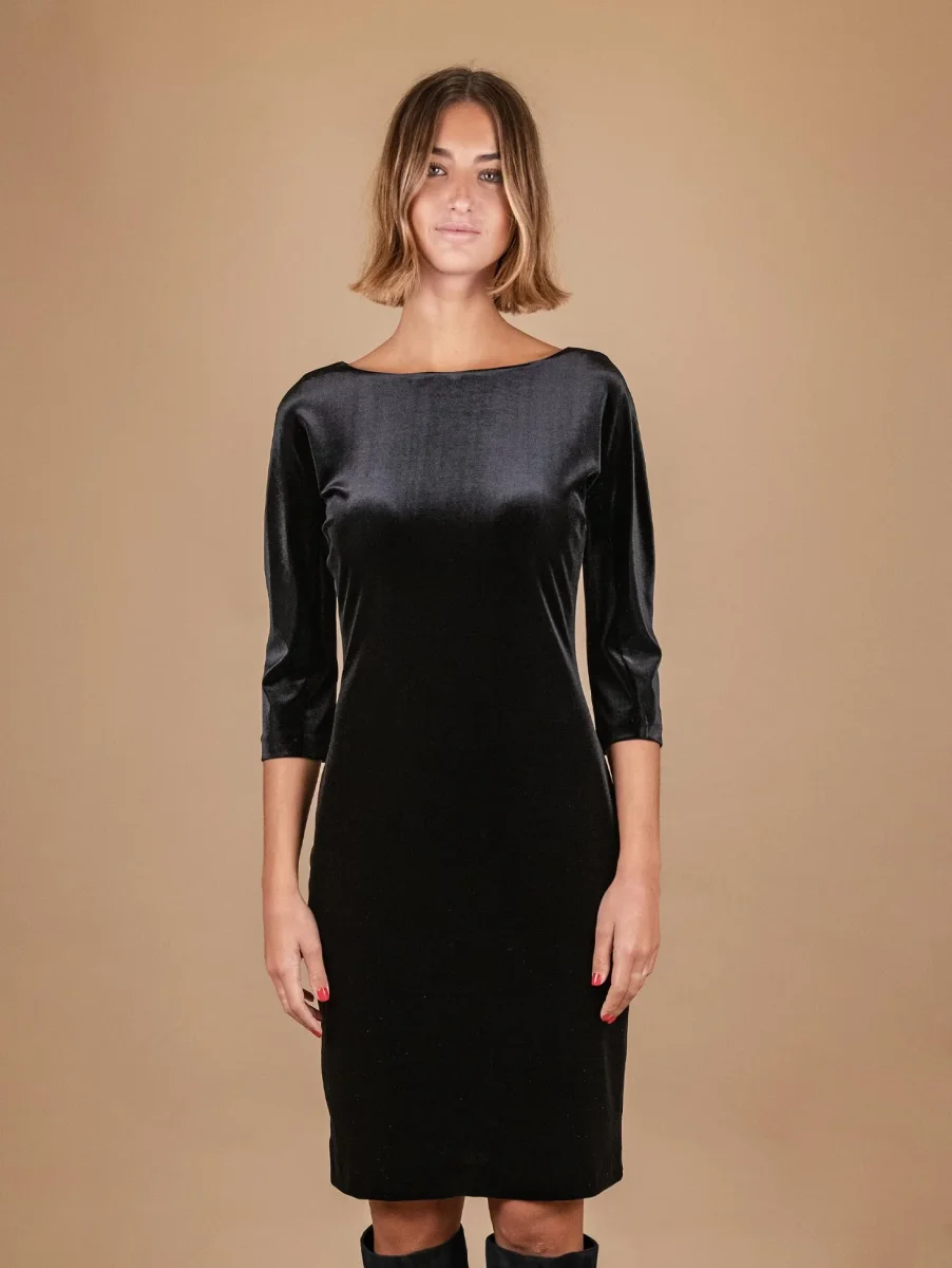 Tubino semplice in velluto nero. Un capo elegante, femminile e caldo allo stesso tempo. Chiusura zip a scomparsa sulla parte posteriore del capo. Manica tre quarti. Interno sfoderato Vestibilità regolare. Peso abbondante. Composizione: 98% poliestere 2% elastane. La modella è alta 1.81 cm e indossa una S.