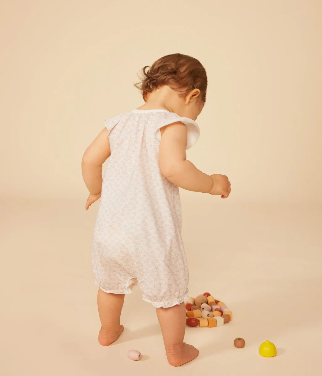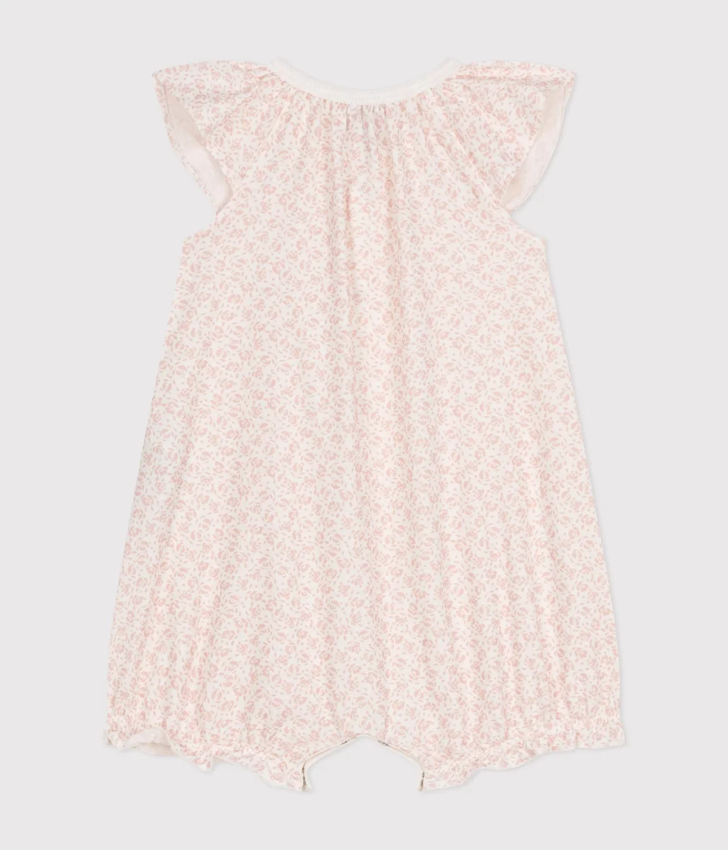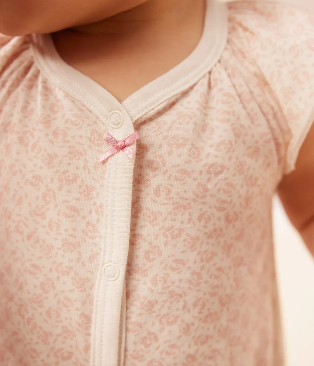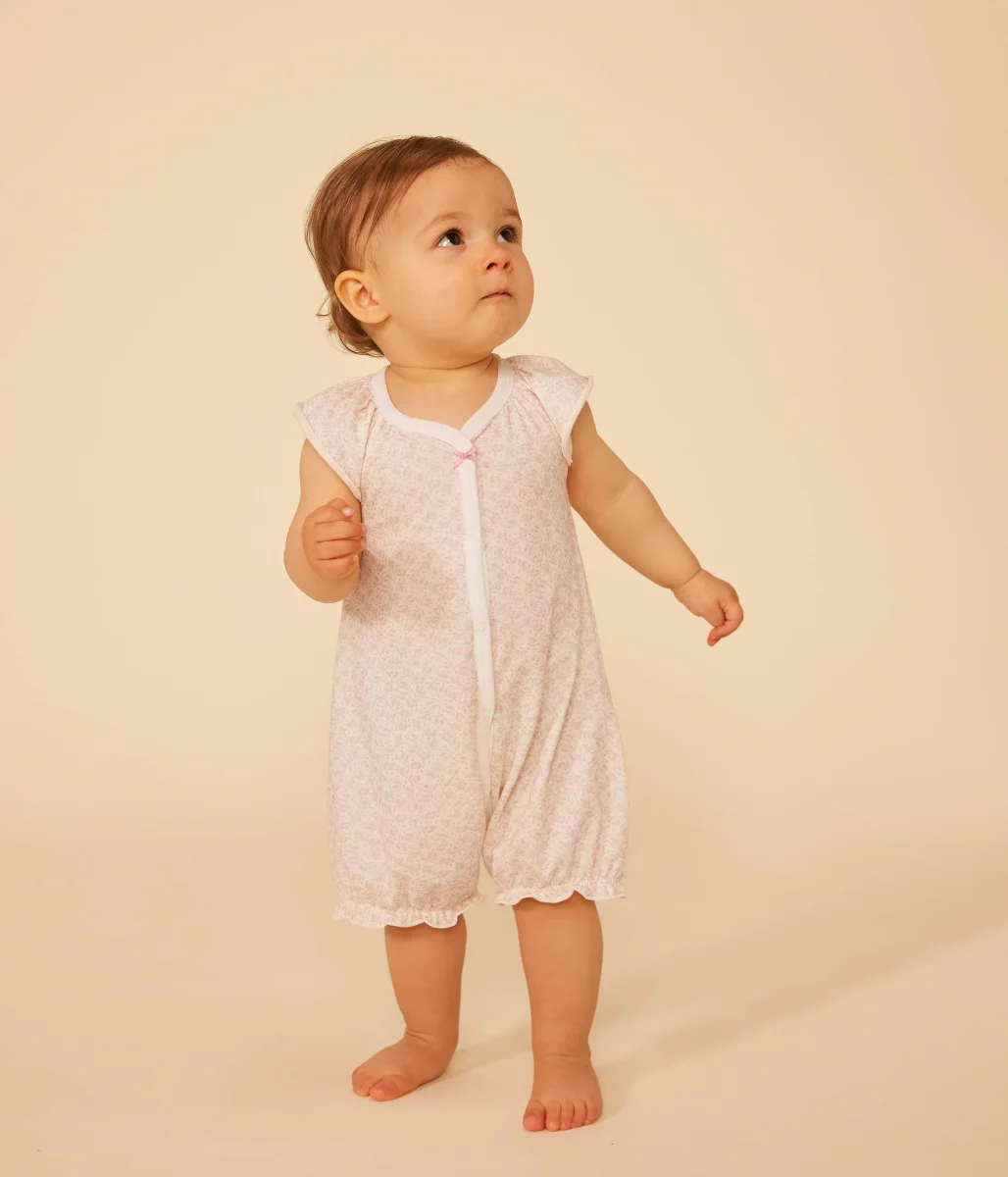 Tutina corta bambina a costine, il materiale emblematico di Petit Bateau. Stampa piccoli fiori rosa.
