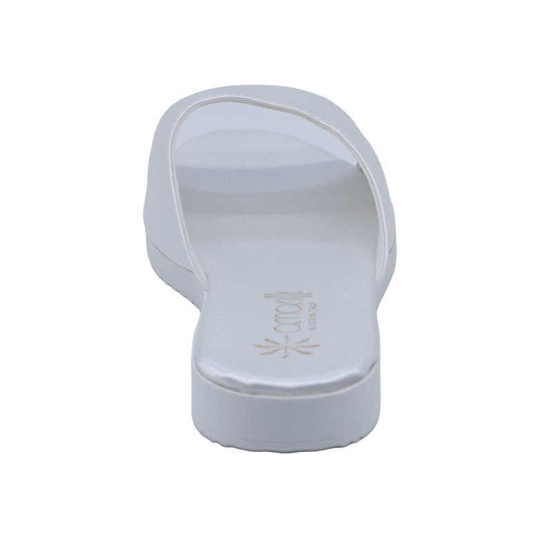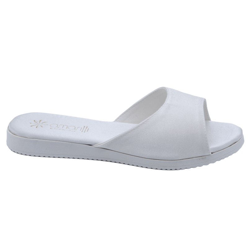 Realizzate con tomaia a fascia in Raso Bianco, le ciabatte da sposa Viola hanno la fodera della tomaia in pelle camoscino e la soletta in raso.