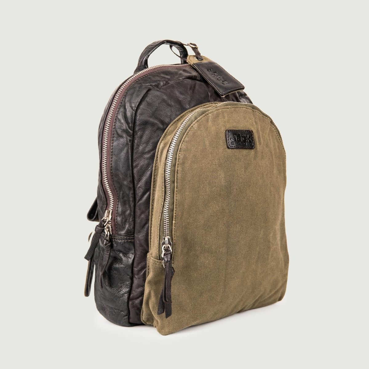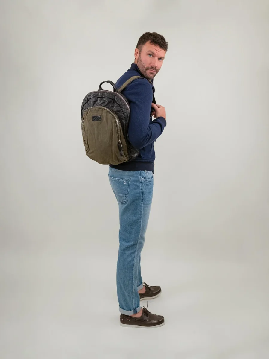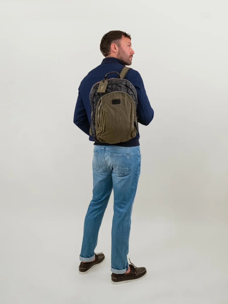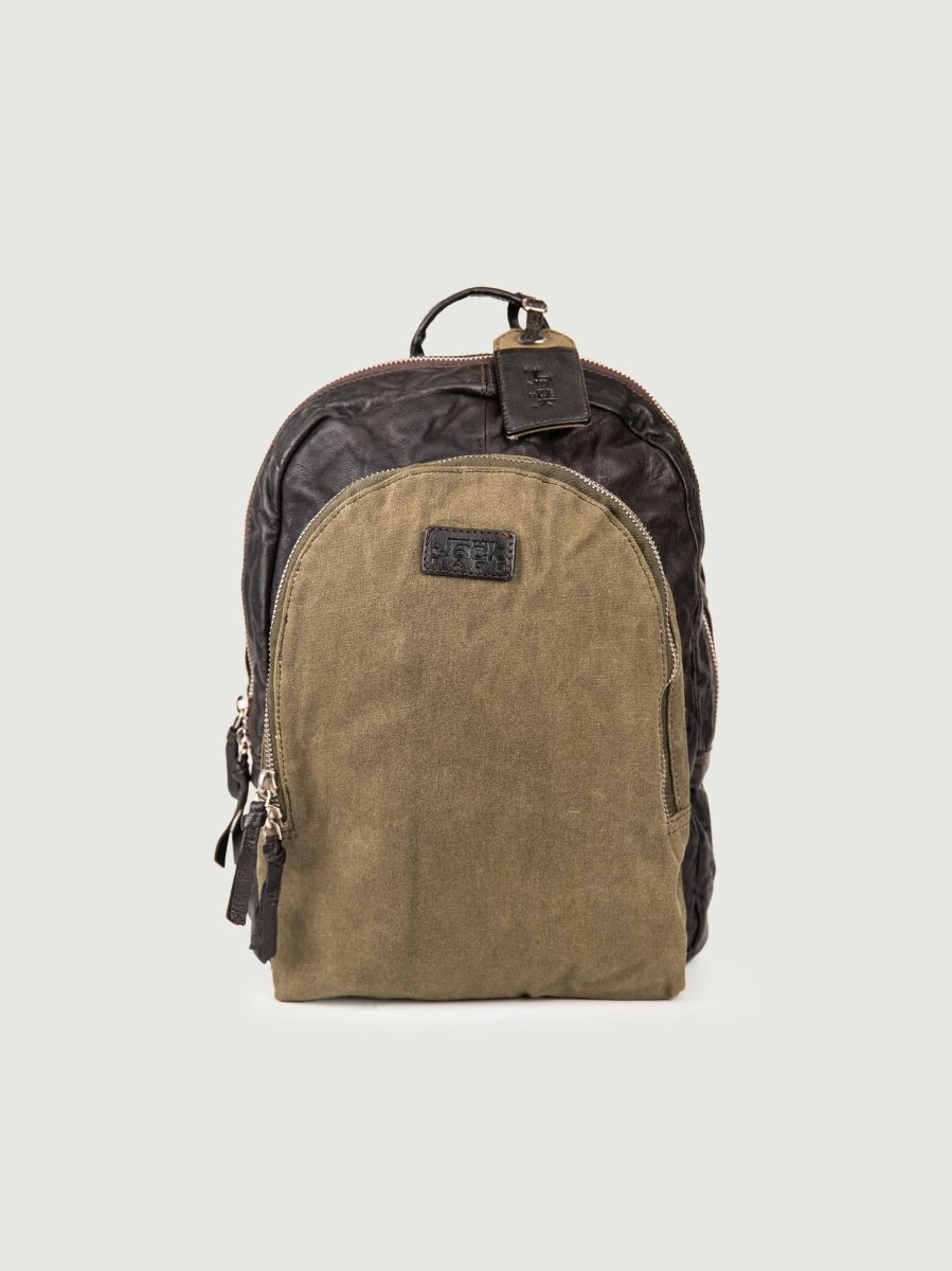 Zaino in pelle effetto used dark brown e tessuto color fango.