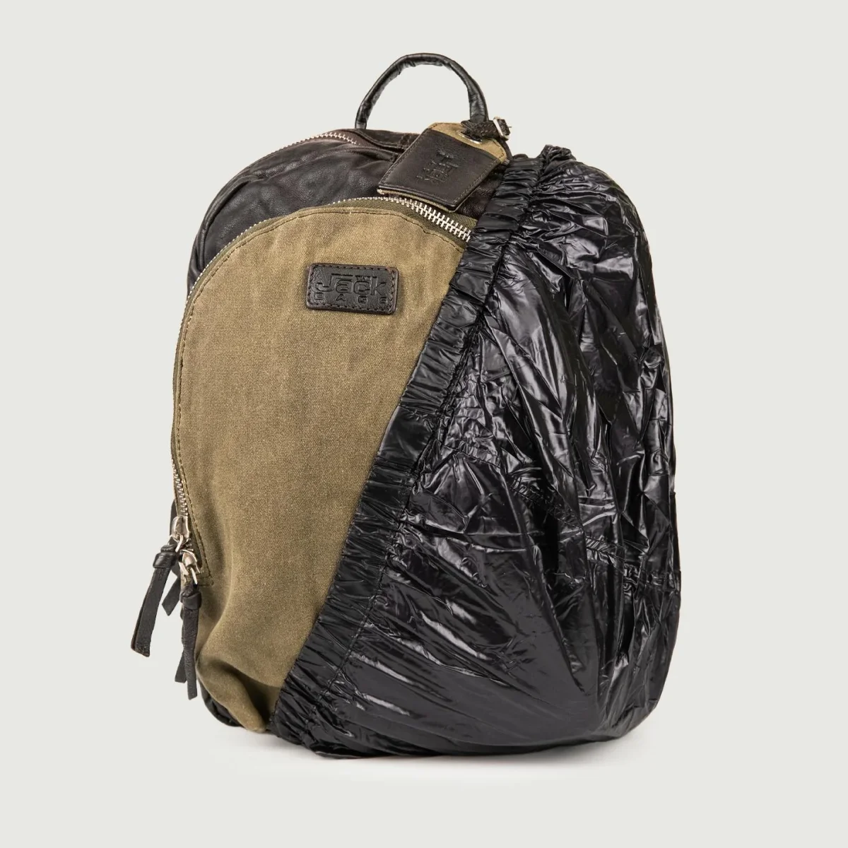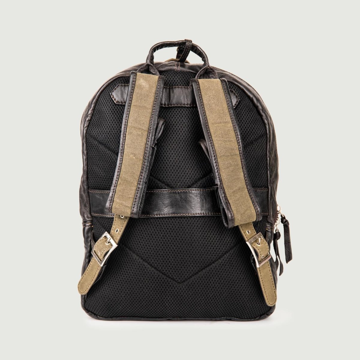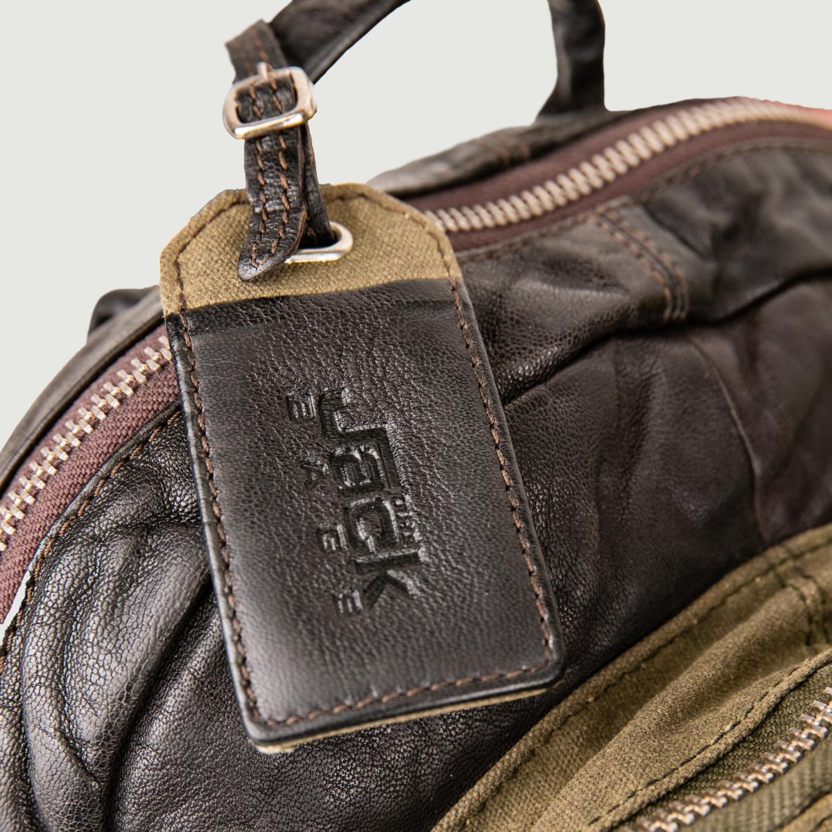 Zaino in pelle effetto used dark brown e tessuto color fango.