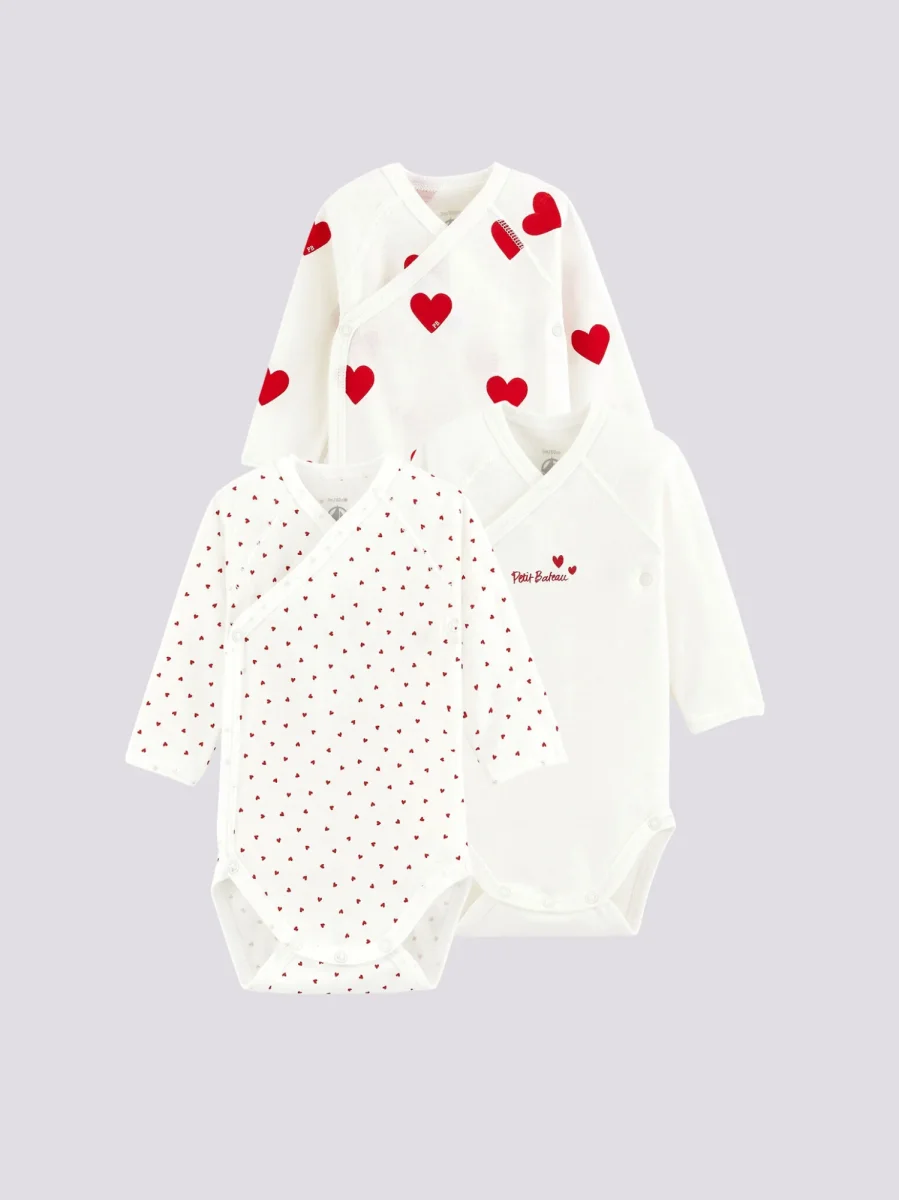 CONFEZIONE DA 3 BODY INCROCIATI IN COTONE CON MOTIVO A CUORE
